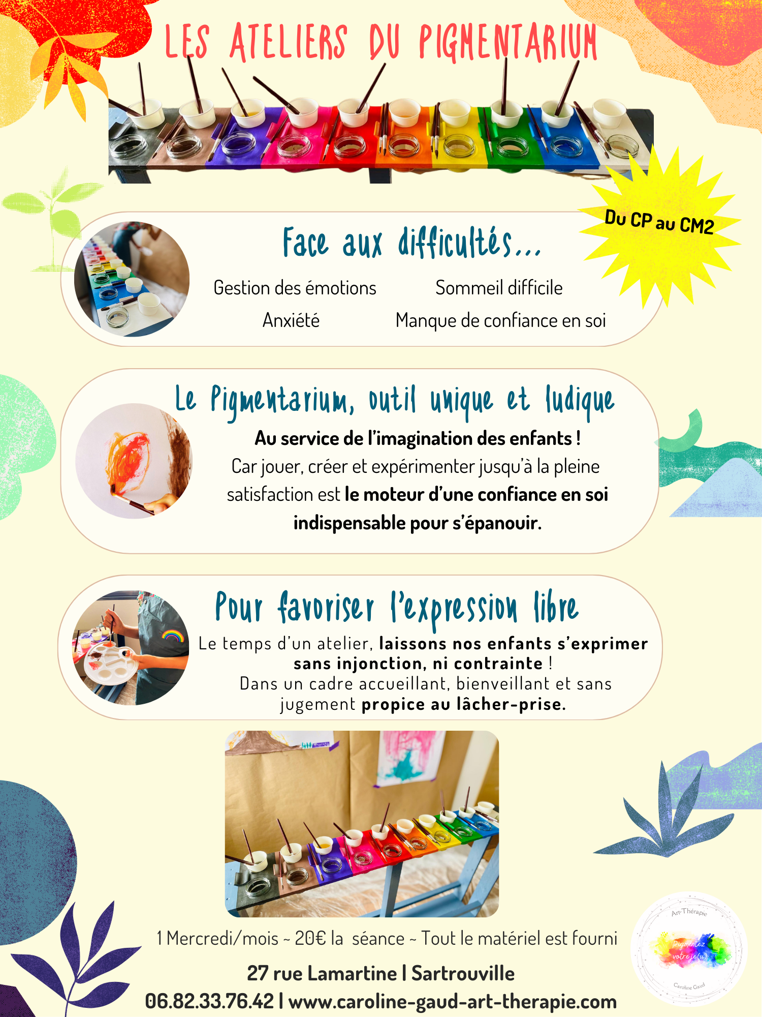 Je propose également des ateliers dédiés à la créativité en petits groupes qui n’ont pas de visée thérapeutique mais qui ouvrent à la confiance en soi par la création pleine et entière sans injonction ni contrainte. ‘Les Ateliers du Pigmentarium’ ont lieu un mercredi par mois.